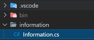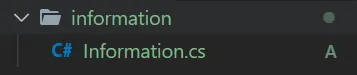 Egy törölt fájl visszaállítását mutatom most be Git verziókezelő segítségével. A szituáció az alábbi: van egy Information.cs fájlom, ami egy information mappában található. Én ezt törlöm, majd commit és push a változtatásnak.