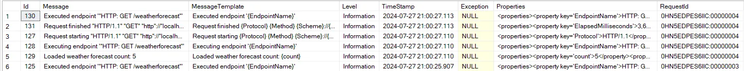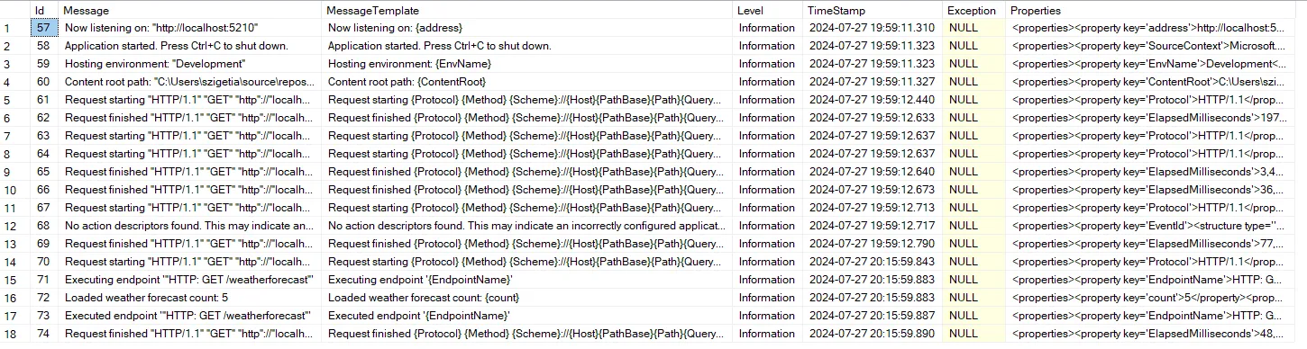 Érdemes még két beállítást megemlíteni az addStandardColumns és a removeStandardColumns lehetőségeket. A nevükből adódóan a “gyári” adatok hozzáadása és elvétele lehetséges. Ebből nézzük meg a LogEvent hozzáadását, ami azért fontos, mert ennek segítségével JSON formában is tároljuk az adatokat. Ez azért lehet hasznos, mert az SQL Server 2016 verzió óta vannak JSON függvények, amik a keresést lekérdezést egy napló táblában megkönnyíthetik.